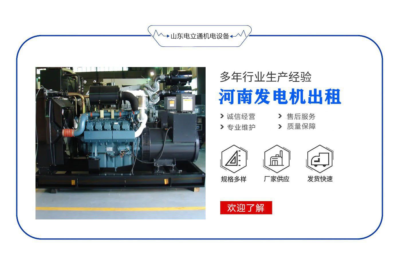 山東電立通機電設備有限公司從事安徽發電機租賃,發電機租賃,大型發電機出租,河南發電機出租,發電機廠家出租等業務,并擁有充足的柴油發電機組資源、隨時為客戶提供不同功率機組自備發電業務,電力供應保障充足,為各項工地施工、消防備用、企業避峰、短期自備發電的首選 。專業員工現場安裝、調試、維護、設備,根據客戶需要24小時隨時發電。并配有專業的操作人員配合機組的發電,提供完善、專業的發電機出租服務,客戶可以定期、不定期或短時租用;同時承接發電機組保養、維修服務。希望我們的服務能給您創造更大的效益。歡迎洽詢!  發電機租賃的優勢:一、租賃全部使用進口柴油發電機組出租/租賃。 它與國產發電機出租/租賃相比具有較強優勢。 技術先進,性能可靠,工作壽命長。.發電機激磁系統能使機組在隨任何瞬間加載時,頻率波動迅速恢復。油耗更省、噪音更低、電壓、頻率更穩定、過載能力更強。  二、專業性強租賃業務我司派專專業人員到現場進行負載核算、選用合適機型安裝、調試、維護、設備,根據客戶需要24小時隨時發電。并配有專業的操作人員配合機組的發電,提供完善、專業的發電機出租服務,客戶可以定期、不定期或短時租用,努力為用戶節省開支、讓客戶無后顧之憂!  三、最完善的服務租賃熱線24小時隨時開通,隨時為用戶提供咨詢服務。  四、方便...